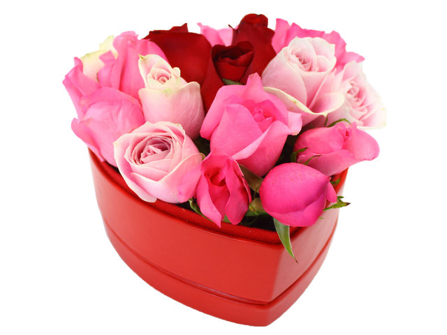12-16支 3種粉紅和紅色系列的玫瑰,安插於心形盒花裏.
