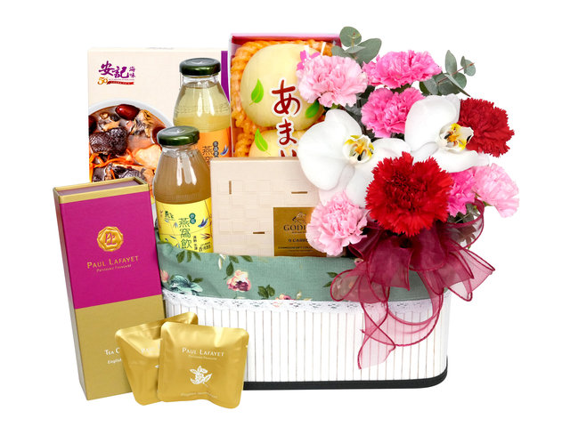 小花籃由康乃馨、蝴蝶蘭及尤加利葉組成。