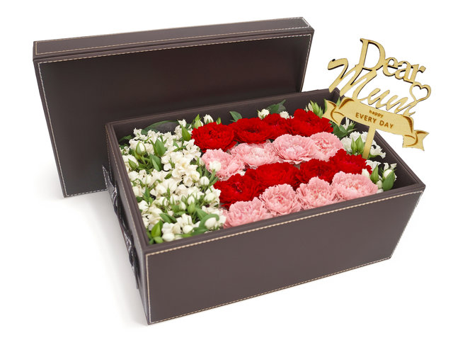 此商品由16枝粉色及紅色康乃馨,配白色小襯花,12×8寸咖啡色長方形仿真皮盒構成。