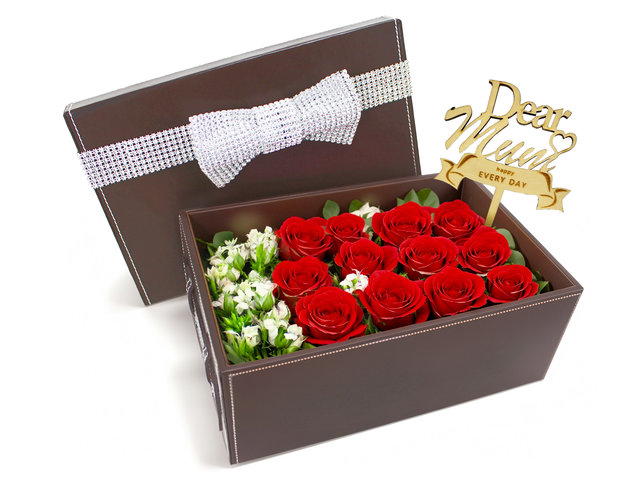 此作品由12枝紅玫瑰,加襯花,咖啡色長方形仿真皮盒構成。