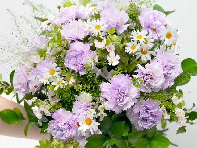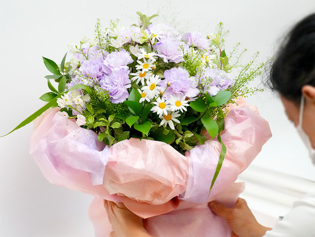 花藝師採用了充滿空氣感與自然線條的設計,打破傳統花束的擁擠感,讓每一朵香芋康乃馨與瑪格麗特雛菊都能展現出靈動的姿態。