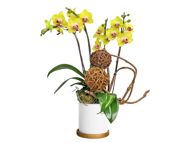 此作品由2枝黃色孖昌蝴蝶蘭花組成,方形花樽,有風格的裝飾設計。盛花器皿將因應不同時節及花種作出調整。